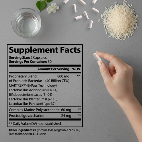 Proprietary Blend of Probiotic Bacteria: MAKTREK® (Bi-Pass Technology), Lactobacillus Acidophilus, Bifidobacterium Lactis, Lactobacillus Plantarum, Lactobacillus Paracasei; Marine Polysaccharide Complex, Fructooligosaccharide, Hypromellose (vegetable capsule), Rice maltodextrin, L-Leucine.